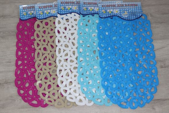 Резиновый коврик в ванную с узором в виде колец. Имеет много присосок с нижней стороны. Создает противоскользящий эффект, кладется на дно ванной или на пол возле нее, а также в душевую. Оптовые заказы собираем пропорционально цветам, которые комплектуются в ящике производителем.
