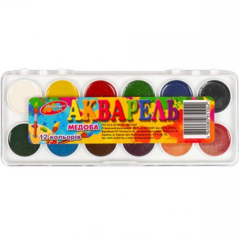 Акварель 12 кольорів, медова, в пластиковій упаковці. Широко використовуються для дитячої творчості, а також для художніх, оформлювальних і декоративно-прикладних робіт. 18,5*7,5см