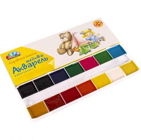 Акварель 14 кольорів, медова, в картонній упаковці. Широко використовуються для дитячої творчості, а також для художніх, оформлювальних і декоративно-прикладних робіт. 17 х 7 см