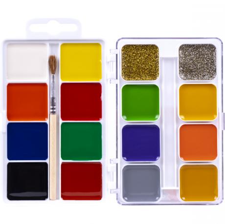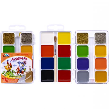 Акварель 16 кольорів, медова, в пластиковій упаковці з пензлем. Широко використовуються для дитячої творчості, а також для художніх, оформлювальних і декоративно-прикладних робіт. 11,5*7,5см