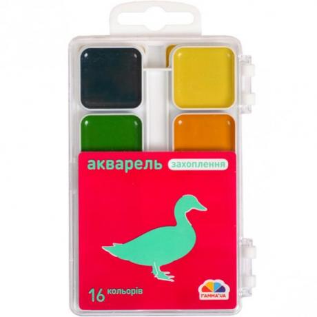 Акварель 16 кольорів, медова, в пластиковій упаковці. Широко використовуються для дитячої творчості, а також для художніх, оформлювальних і декоративно-прикладних робіт. 11,5*7,5см