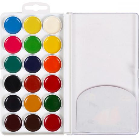 Акварель 18 кольорів , медова, в пластиковій упаковці. Широко використовуються для дитячої творчості, а також для художніх, оформлювальних і декоративно-прикладних робіт. 18,5 * 10 см