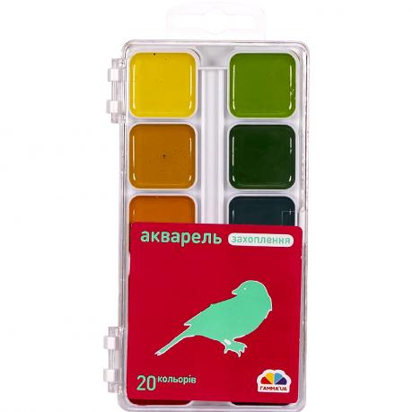Акварель 20 кольорів, медова, в пластиковій упаковці. Широко використовуються для дитячої творчості, а також для художніх, оформлювальних і декоративно-прикладних робіт. 13,5*7,5см