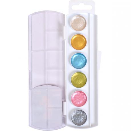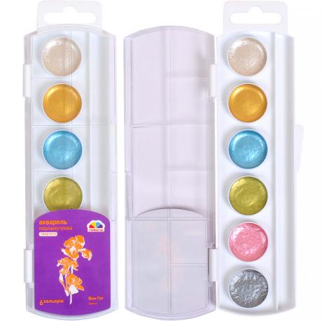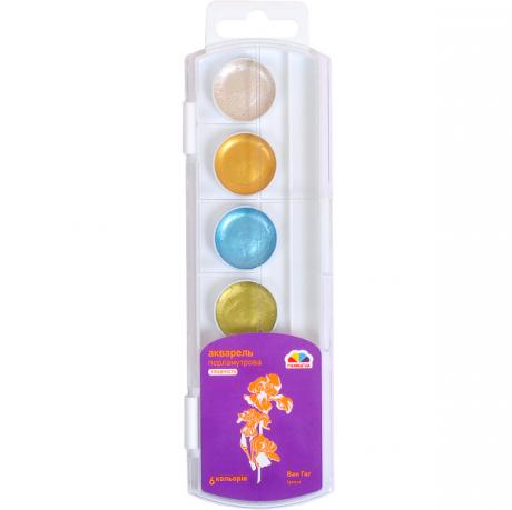 Акварель перламутрова 6 кольорів, медова, в пластиковій упаковці. Широко використовуються для дитячої творчості, а також для художніх, оформлювальних і декоративно-прикладних робіт. 19,5*5,5см