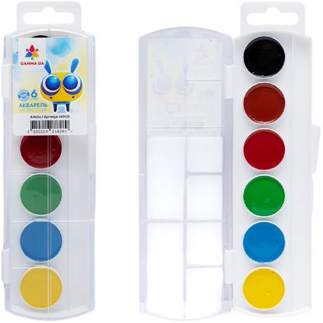 Акварель медова 6 кольорів, в пластиковій упаковці. Широко використовуються для дитячої творчості, а також для художніх, оформлювальних і декоративно-прикладних робіт. 18,5х5,5см