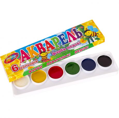 Акварель 6 кольорів, медова, в картонній упаковці. Широко використовуються для дитячої творчості, а також для художніх, оформлювальних і декоративно-прикладних робіт. 18*3,5см
