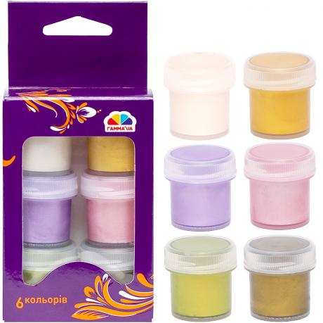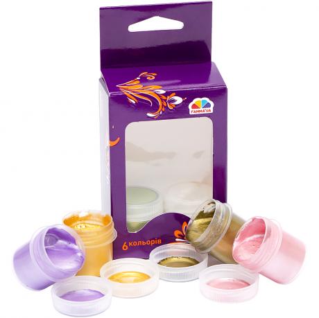 6 перламутрових кольорів, обсяг фарби одного кольору 10 мл. Гуашшю можна працювати не тільки на папері, а й на полотні, на тканині, картоні, фанері. Гуаш широко застосовується в декораційного живопису, при виконанні різних ескізів. Обсяг: 60 мл (6х10 мл)