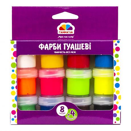 8 кольорів +4 флюорисцентні, об'єм фарби одного кольору 10 мл. Гуашшю можна працювати не тільки на папері, а й на полотні, на тканині, картоні, фанері. Гуаш широко застосовується в декораційному живописі при виконанні різних ескізів. Об'єм: 120 мл (12х10 мл) Упаковка 9,5х12,5х3,5см