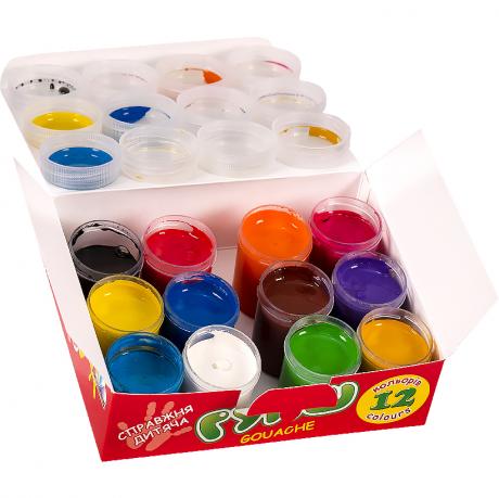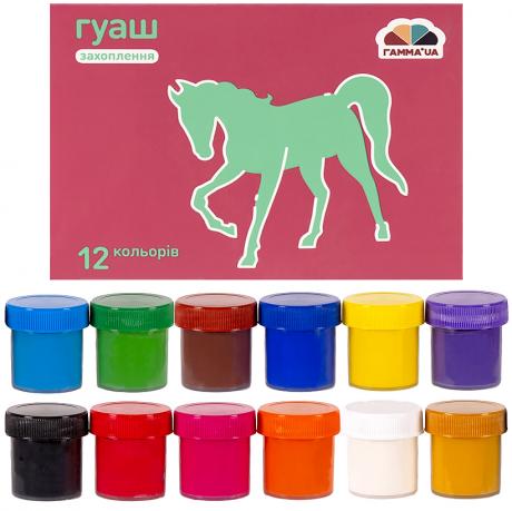 12 кольорів, обсяг фарби одного кольору 20 мл. Гуашшю можна працювати не тільки на папері, а й на полотні, на тканині, картоні, фанері. Гуаш широко застосовується в декораційного живопису, при виконанні різних ескізів. Обсяг: 240 мл (12х20 мл)
