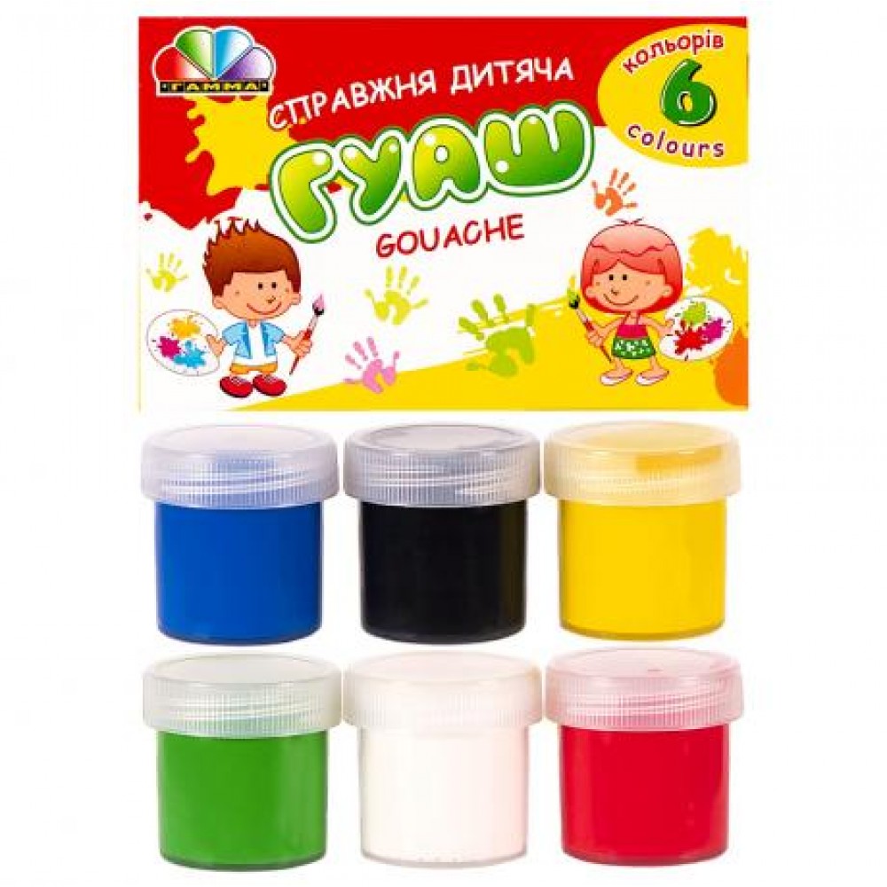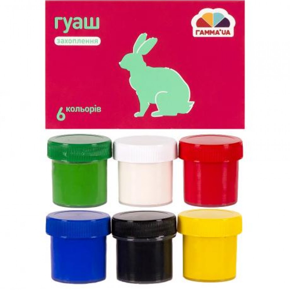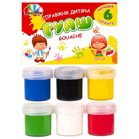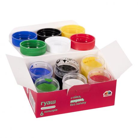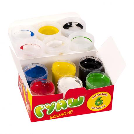 6 кольорів, обсяг фарби одного кольору 20 мл. Гуашшю можна працювати не тільки на папері, а й на полотні, на тканині, картоні, фанері. Гуаш широко застосовується в декораційного живопису, при виконанні різних ескізів. Обсяг: 120 мл (6х20 мл)