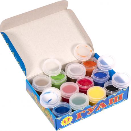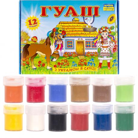 Фарби гуашеві 12 кольорів по 20мл. Кольори: білий, жовтий, помаранчевий, блакитний, чорний, червоний, світло-зелений, темно-зелений, синій, темно-коричневий, світло-коричневий, малиновий. Фарби призначені для художньо-декоративних робіт. Розмір коробки 12.5х17х4см. вік 3+