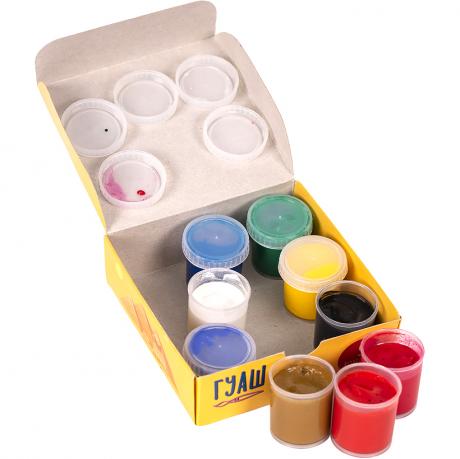 Для дитячої творчості 9 кольорів по 15мл. Гуашшю можна працювати не тільки на папері, а й на полотні, на тканині, картоні, фанері. гуаш широко застосовується в декораційного живопису, при виконанні різних ескізів .Розмір 10х10х4см. Вік 3+
