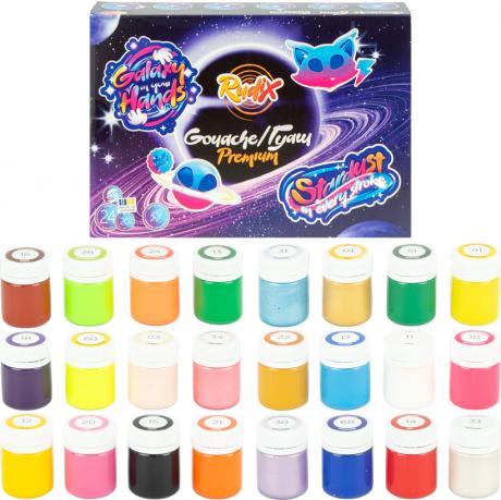 Повноцінний універсальний набір гуашевих фарб містить 24 яскраві відтінки, серед яких — флуоресцентні, блискучі та металічні кольори. Ідеально підходить для малювання, декору, творчих та DIY-проєктів. Фарби легко наносяться, добре змішуються та підходять для різних поверхонь: папір, полотно, картон, дерево тощо.