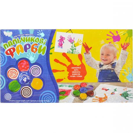 Фарби для малювання пальцями. У наборі: фарби 4 кольори - синій, зелений, жовтий, червоний, палітра, інструкція. Нетоксичні. Розмір упаковки: 27,5х15х3 см. Українська мова. Вік: 3+