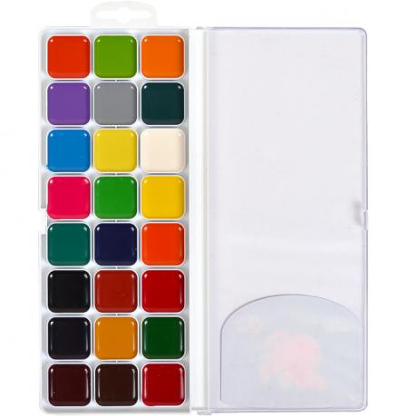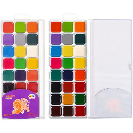 Акварель містить 24 кольори медової консистенції в пластиковій упаковці. Продукт підходить для дитячої творчості, а також для художніх, оформлювальних і декоративно-прикладних робіт. Розмір упаковки 24 * 10 см.