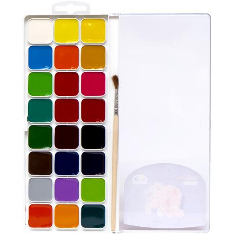 Акварель на основі меду, що містить 24 кольори, упакована в пластиковий контейнер. В комплекті є пензлик. Використовується для дитячої творчості, художніх, оформлювальних та декоративно-прикладних робіт. Розмір упаковки 24 * 10 см.