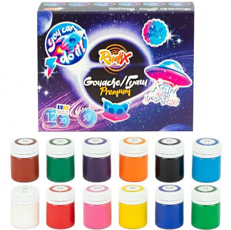 Універсальний набір гуашевих фарб — чудовий вибір для творчості вдома, у школі чи студії. У комплекті 12 яскравих кольорів у баночках по 20 мл. Фарби мають щільну, кремову текстуру, легко наносяться, добре змішуються та утворюють рівномірне матове покриття. Підходять для малювання на папері, картоні, фанері та інших поверхнях.
