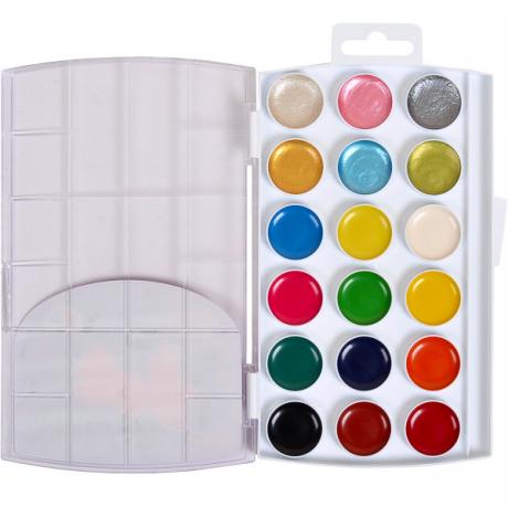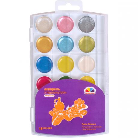 Набір акварелі містить 18 кольорів, з яких 12 стандартних, 3 перламутрових і 3 флуоресцентних. Виготовлена на медовій основі, упаковка пластикова. Використовується для дитячої творчості, художніх і декоративно-прикладних робіт. Розміри упаковки 19,5 * 11,5 см.