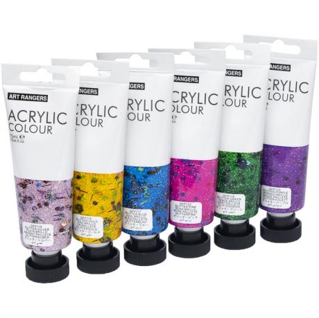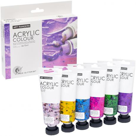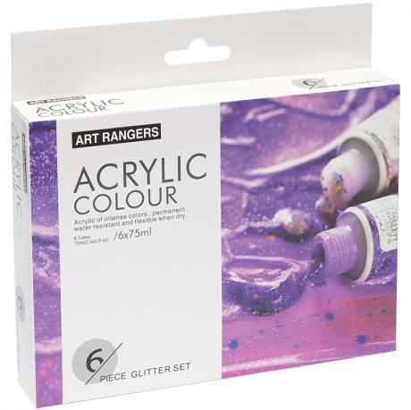 У комплекті — 6 туб акрилових фарб з блискітками по 75 мл кожна. Упаковані в картонну коробку розміром 21×15,5×3,5 см — зручно для зберігання та транспортування.