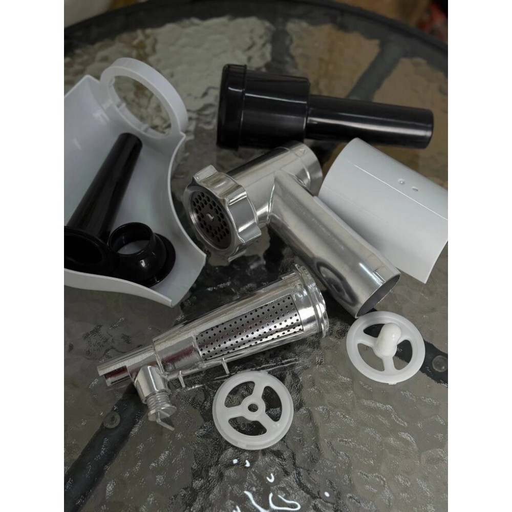 В комплекте: 1 нож, 2 режущих диска, толкатель, насадки для кеббе и колбас