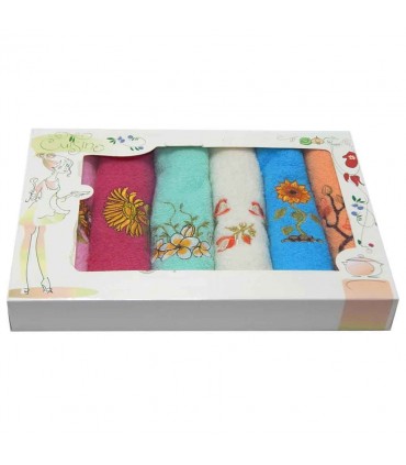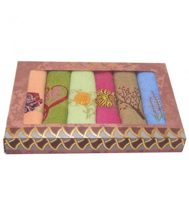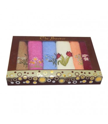 В нашем магазине наборы таких салфеток представлены в цветочной тематике. Цветовая гамма очень широка, есть салфетки как приглушенных тонов, так и очень ярких сочных цветов. Изделия предлагаются в оттенках розового, зеленого, синего, коричневого и молочного. Узоры выполнены с помощью вышивки, полевые цветы выглядят очень гармонично и красиво, края салфетки тщательно обработаны, при этом имеют аккуратный вид. Набор расположен в оригинальной презентабельной упаковке с ручками от производителя.