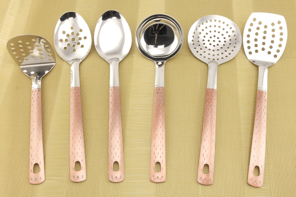 Кухонные наборы состоят из принадлежностей, без которых сложно представить современную кухню. Используя кухонные принадлежности, можно значительно упростить процесс и сократить время приготовления блюд. Набор изготовлен из нержавеющей стали с медным напылением. Нержавеющая сталь безвредна для здоровья, не изменяет вкус и запах пищи, выдерживает воздействие высоких температур, прочная и износостойкая. Такой набор станет хорошим и практичным подарком и долго прослужит помощником на кухне.
