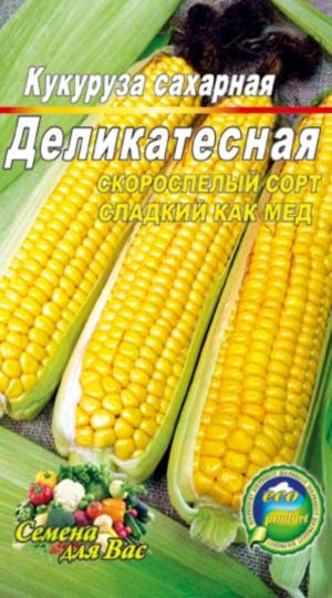 Кукуруза Деликатесная Раннеспелый сорт. Вегетационный период от всходов до технической спелости 80-90 дней. Растение среднерослое. Початки цилиндрической формы, слегка конусовидные, длиной 15-20см, массой 160-190г. Зерна сочные и сладкие, хороших вкусовых качеств. Кочаны потребляют в вареном виде, а также используют для консервирования и замораживания. Для продления периода сбора свежих початков, кукурузу следует высевать 3-4 раза, с интервалом 10-15 дней.