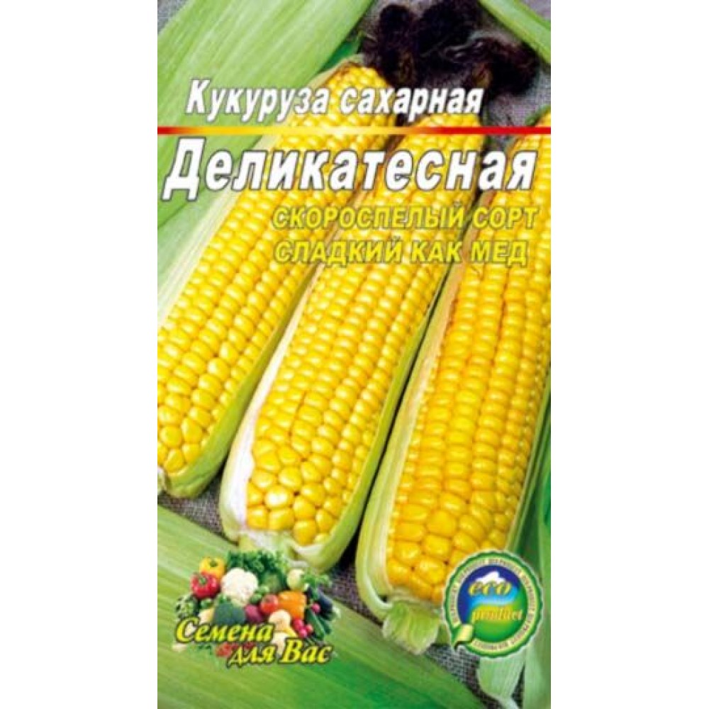 Кукуруза Деликатесная Раннеспелый сорт. Вегетационный период от всходов до технической спелости 80-90 дней. Растение среднерослое. Початки цилиндрической формы, слегка конусовидные, длиной 15-20см, массой 160-190г. Зерна сочные и сладкие, хороших вкусовых качеств. Кочаны потребляют в вареном виде, а также используют для консервирования и замораживания. Для продления периода сбора свежих початков, кукурузу следует высевать 3-4 раза, с интервалом 10-15 дней.
