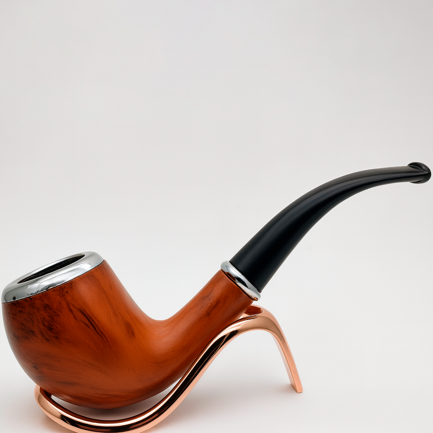 Классическая курительная трубка CHANG FENG с элегантным древесным оттенком и современными деталями. Чаша выполнена из бакелита с металлической вставкой и украшена серебристым ободком, что придаёт изделию утончённый вид. Чёрный пластиковый мундштук плавно изогнут и удобен в использовании, легко снимается для чистки. Трубка представлена на стильной металлической подставке цвета «розовое золото», которая подчёркивает её премиальный вид.