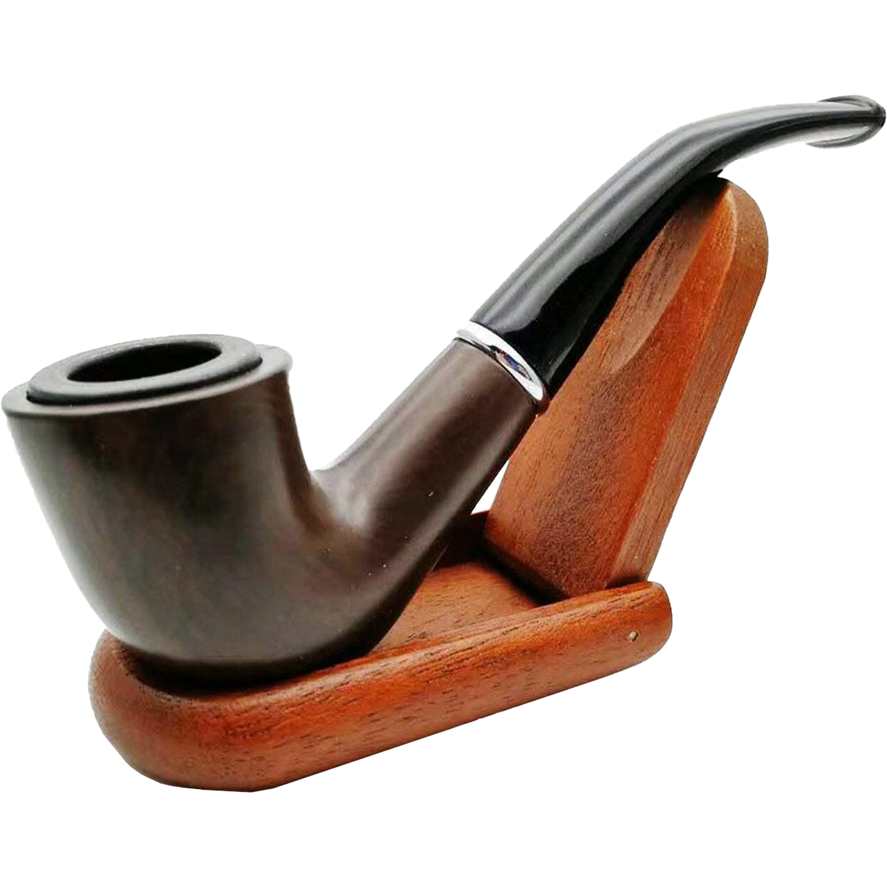 Классическая курительная трубка CHANG FENG в полу изогнутом стиле bent billiard. Чаша гладкая, тёмно-коричневая (под древесину), без металлического ободка сверху. Внутри — металлическая вставка камеры. На стыке чубука и мундштука — аккуратное хромированное кольцо. Чёрный глянцевый мундштук эргономично изогнут.