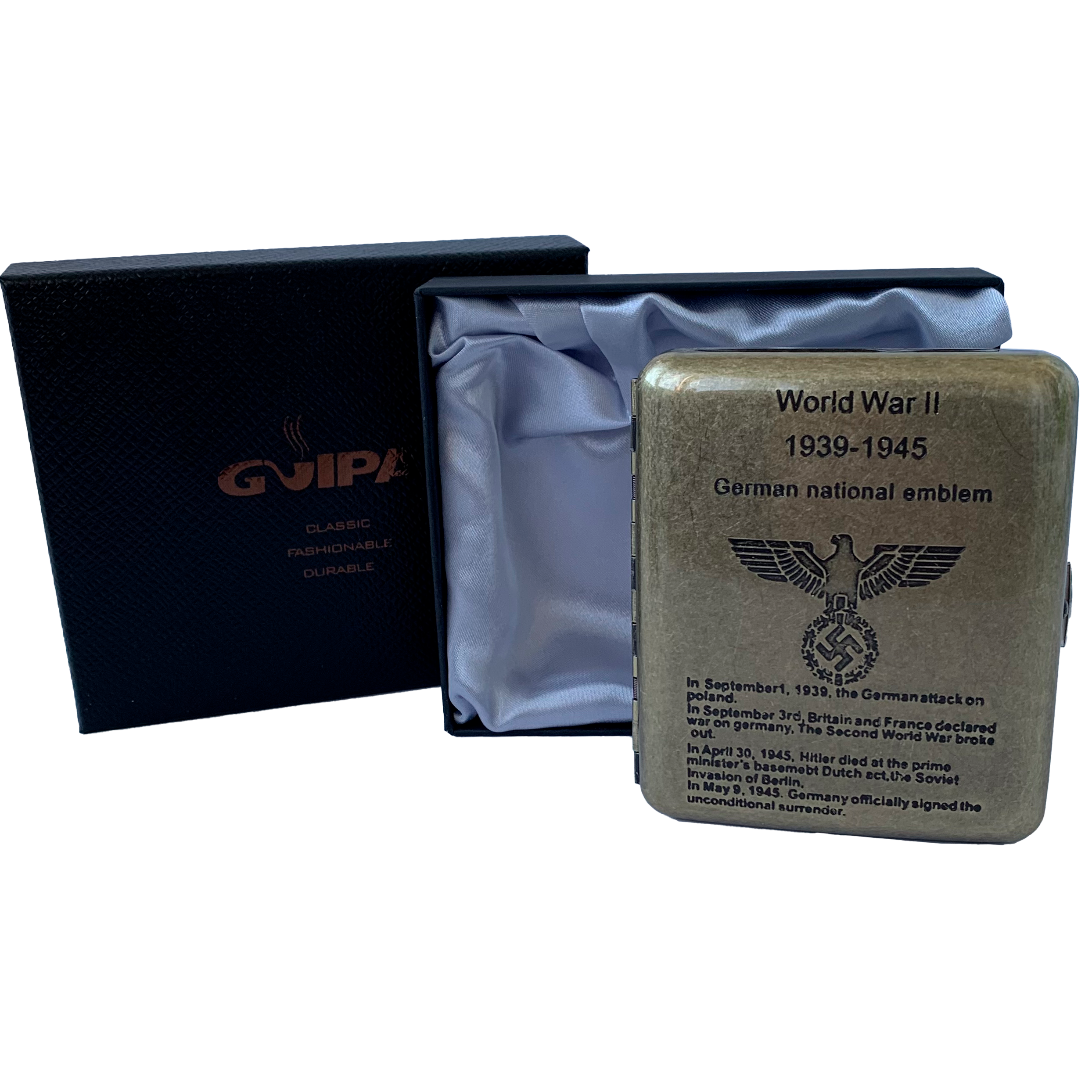 Металлический портсигар в винтажном стиле, выполненный с гравировкой символики периода Второй мировой войны. Можно использовать как аксессуар или тематический сувенир.