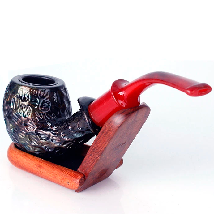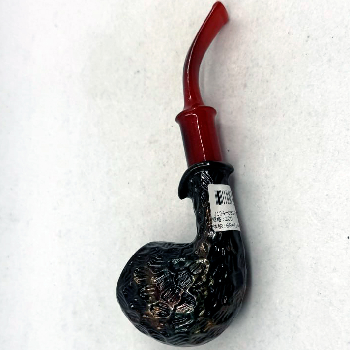 Курительная трубка с необычным современным дизайном, сочетающая стиль и практичность. Чаша выполнена в тёмных оттенках с декоративной фактурной поверхностью, имитирующей ручную обработку. Внутри — металлическая вставка для удобства эксплуатации и долговечности. Мундштук изготовлен из пластика ярко-красного цвета, изогнутой формы, что обеспечивает удобство при курении.