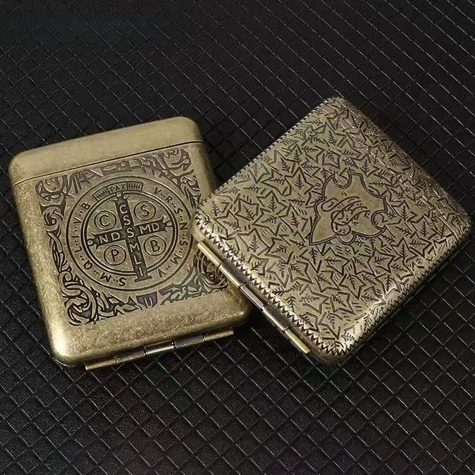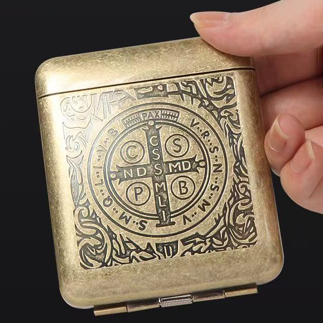 Корпус выполнен в винтажном стиле с декоративным тиснением в виде знаменитого монашеского креста Святого Бенедикта, который считается символом защиты и силы. Такой портсигар станет не только удобным способом хранения сигарет, но и эффектным атрибутом, подчеркивающим индивидуальность владельца.