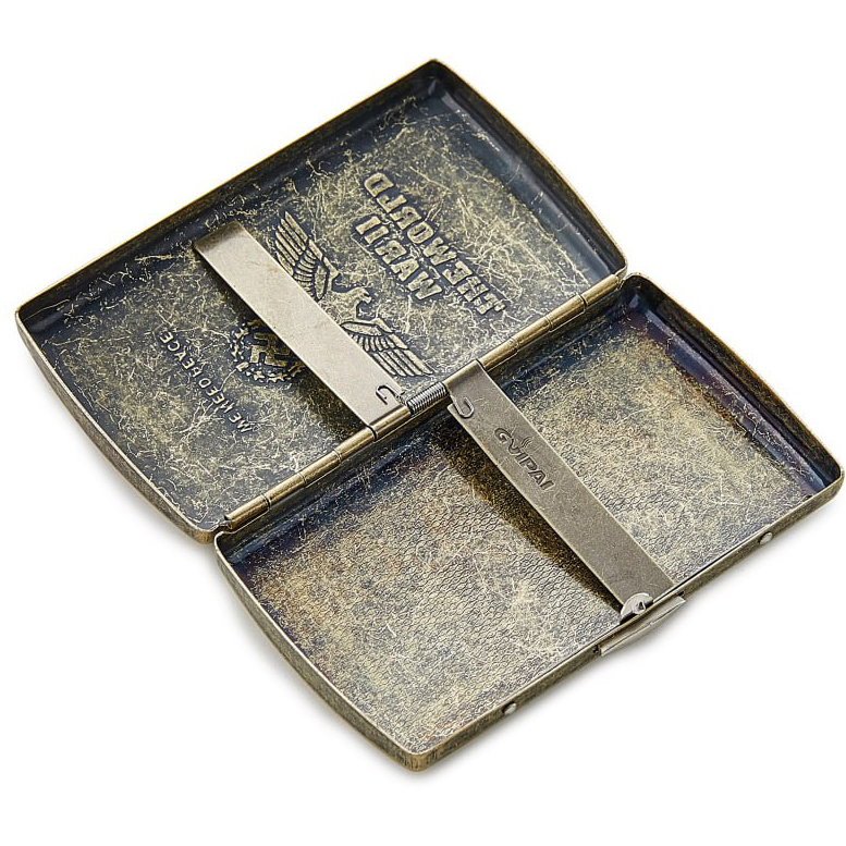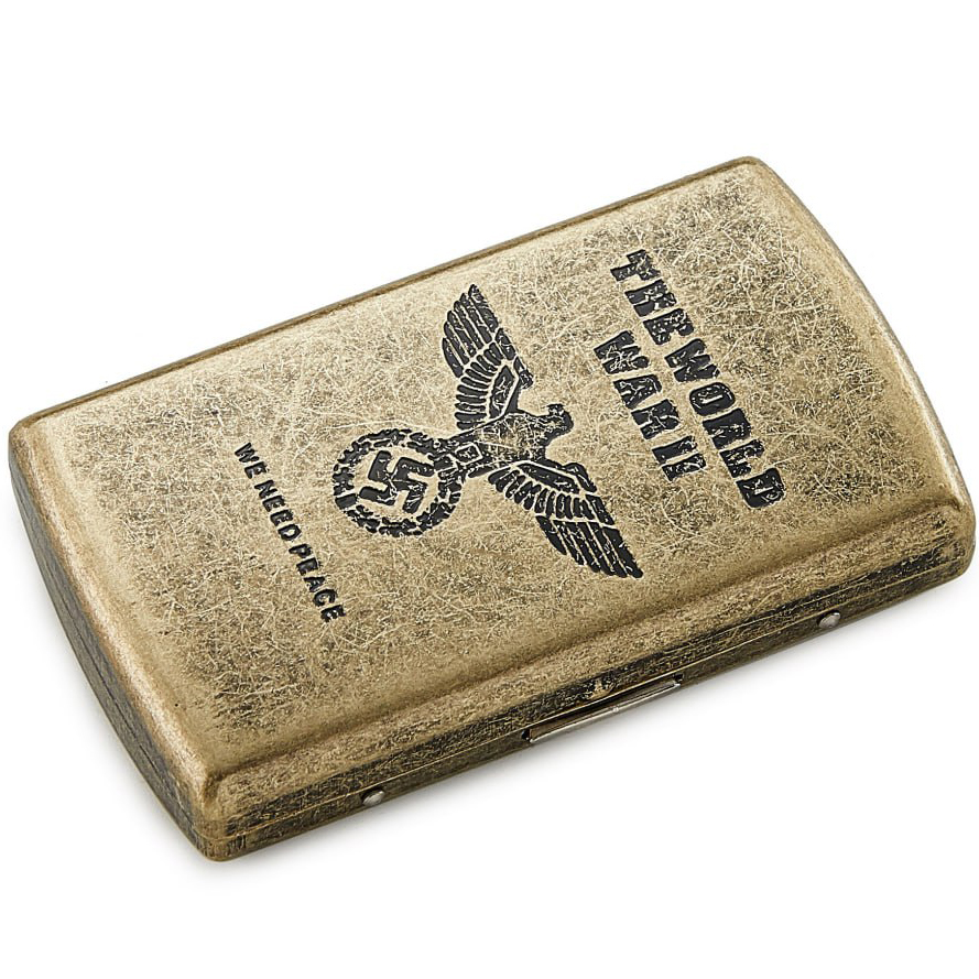 Элегантный портсигар из прочного металлического сплава с бронзовым покрытием — стильный аксессуар для хранения и защиты сигарет. Украшен изящной гравировкой с нацистской символикой (орёл со свастикой и надписью THE WORLD WAR II), что придаёт ему антикварный характер. Компактный и удобный, легко помещается в карман или сумку, обеспечивая сохранность сигарет.