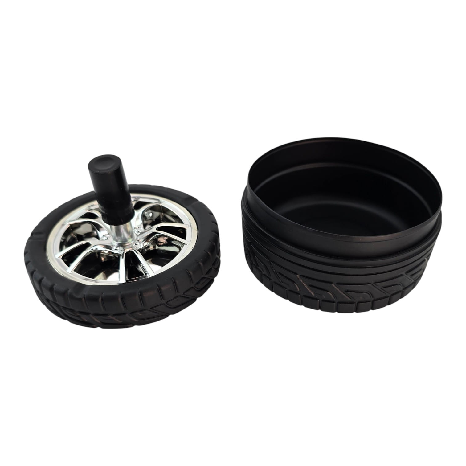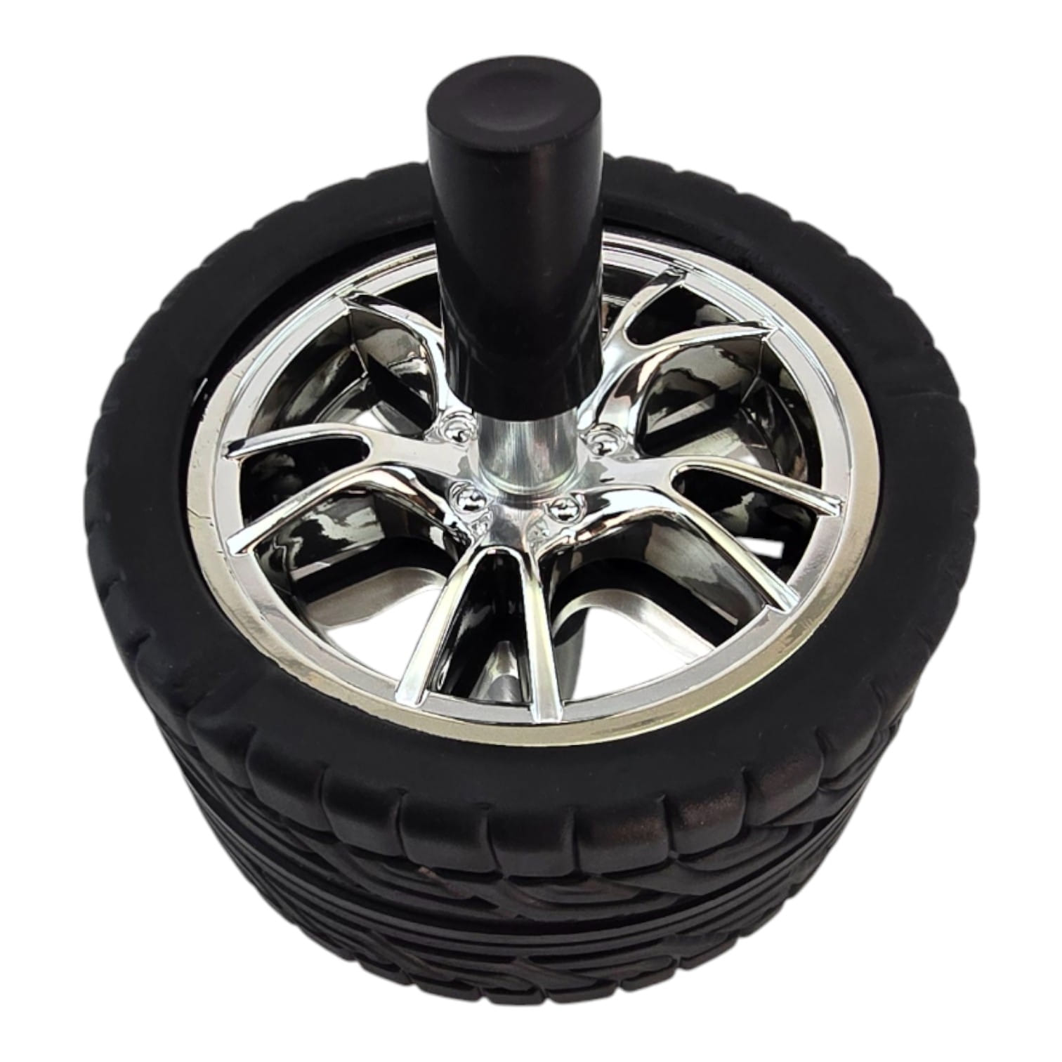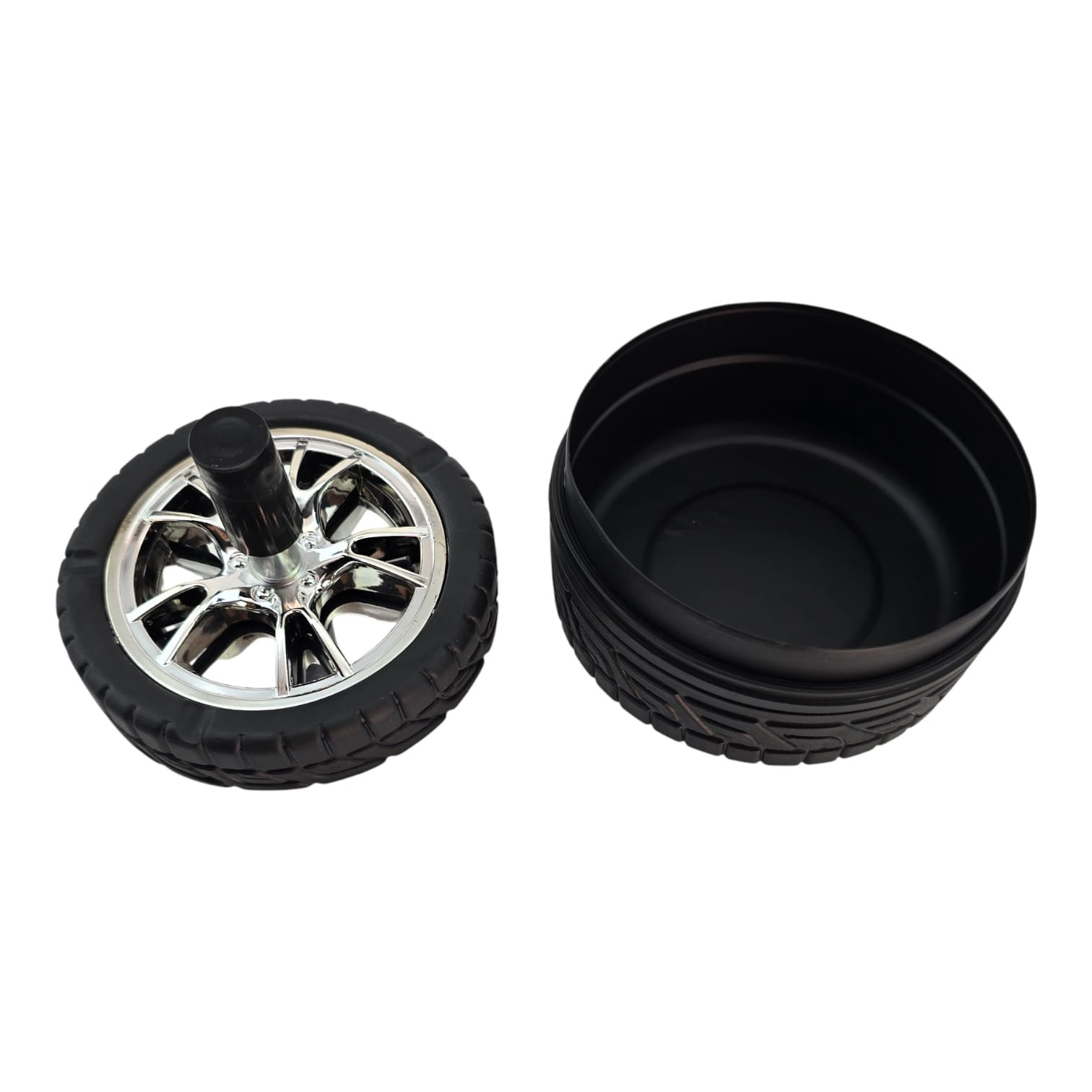 Эффектная пепельница для любителей авто-тематики. Корпус оформлен как стопка шин с реалистичным протектором: сверху металлическая чашка с пресс-механизмом, диск - пластиковый с хром-блеском, шины - резиновые. Нажмите на кнопку - крышка проворачивается, пепел и окурки попадают внутрь. Меньше запаха и сквозняков, поверхность вокруг остаётся чистой. Подойдёт для дома, террасы, гаража; отличный подарок автомобилисту и декор для бара или кофейни в авто-стиле.