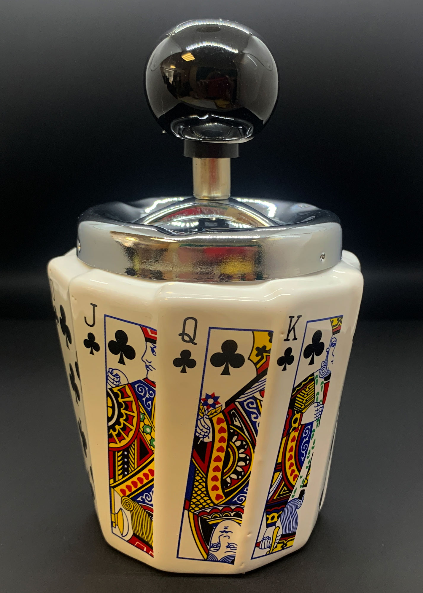Пепельница имеет высоту 150 мм и диаметр 95 мм вверху и 70 мм внизу. Ее форма вдохновлена мастями игральных карт "Трефа" . Уникальность этого изделия подчеркивается его граненной формой, которая состоит из 10 граней, на каждой из которых изображена игральная карта. Этот особый дизайн пепельницы делает ее не только практичным предметом, но и привлекательным элементом интерьера.