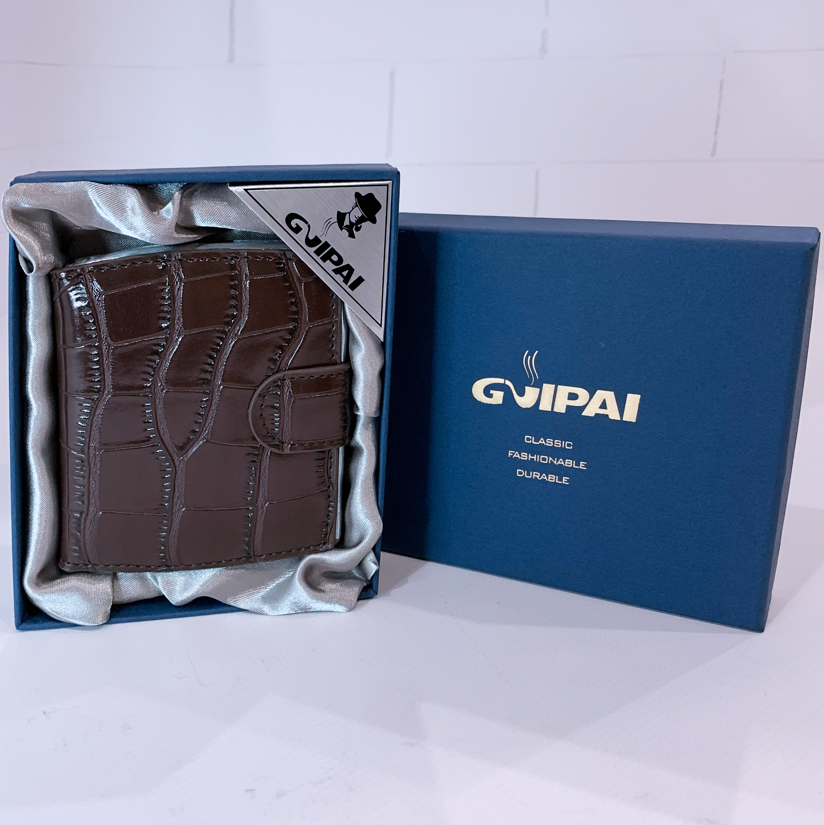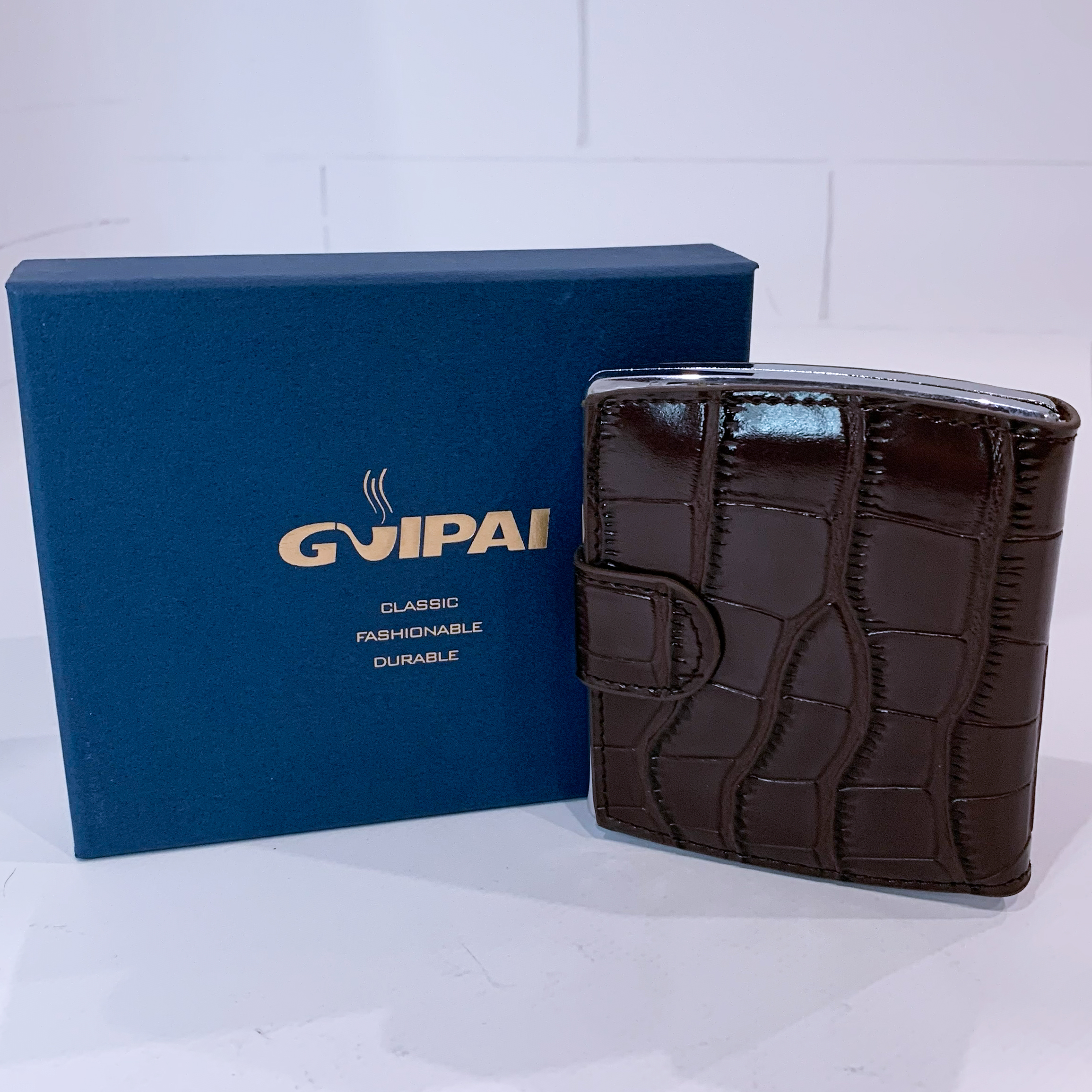 Элегантный и стильный аксессуар для хранения сигарет. Корпус выполнен из прочного металла, а обложка имеет декоративное покрытие с тиснением под кожу крокодила, что придаёт изделию роскошный и солидный вид. Надёжная защёлка обеспечивает удобное и безопасное закрытие.
