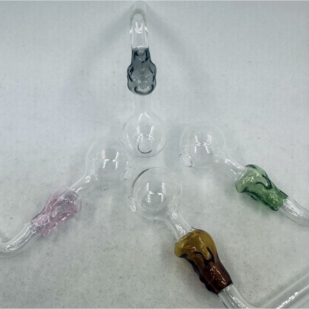 Оригинальные стеклянные трубки в форме буквы «Г» — это удобный и стильный курительный аксессуар. Изделие имеет прозрачное тело и шарообразную чашу, дополненную цветным декоративным элементом. В ассортименте представлены варианты с акцентами: розовый, серый, янтарный и зелёный.