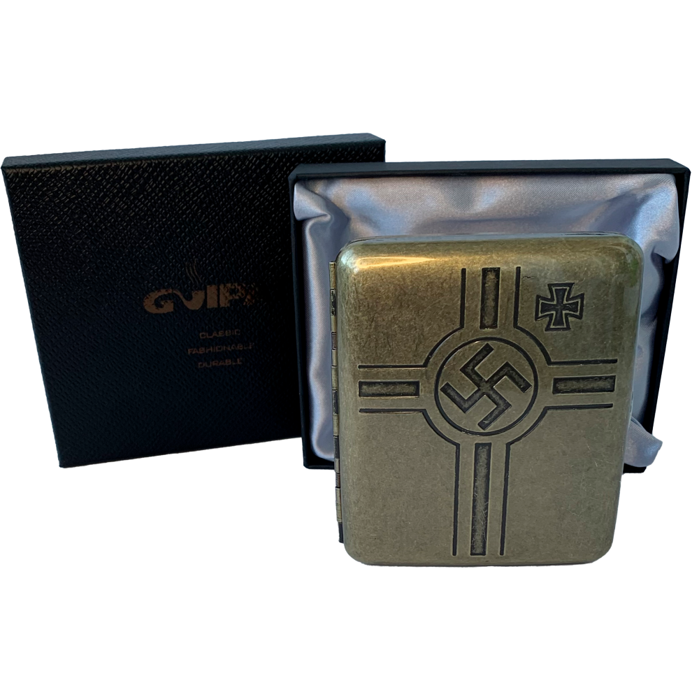 Металлический портсигар в винтажном стиле, выполненный с гравировкой символики периода Второй мировой войны. Можно использовать как аксессуар или тематический сувенир.