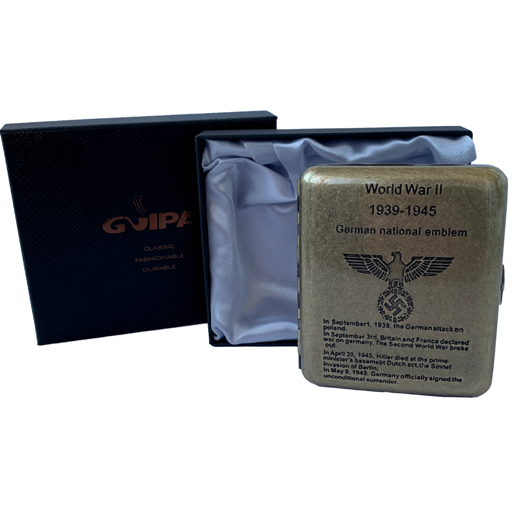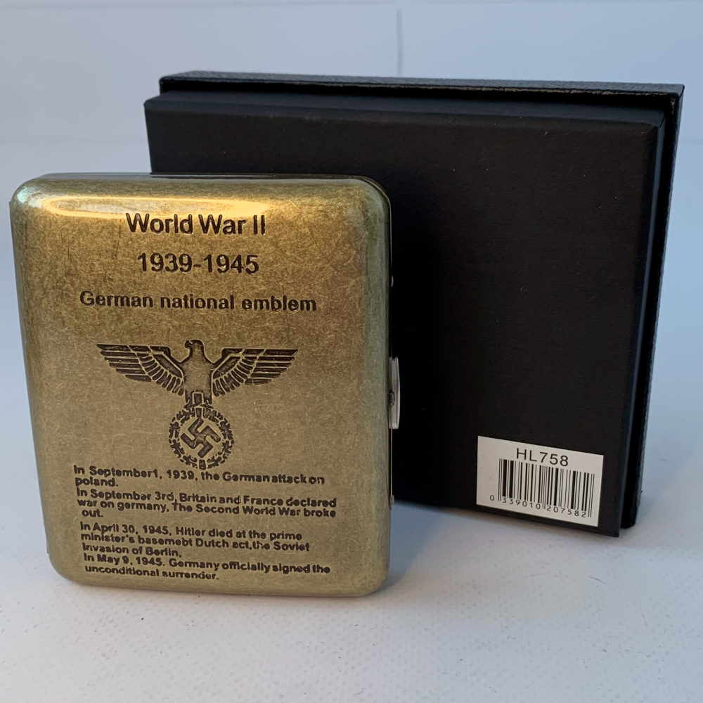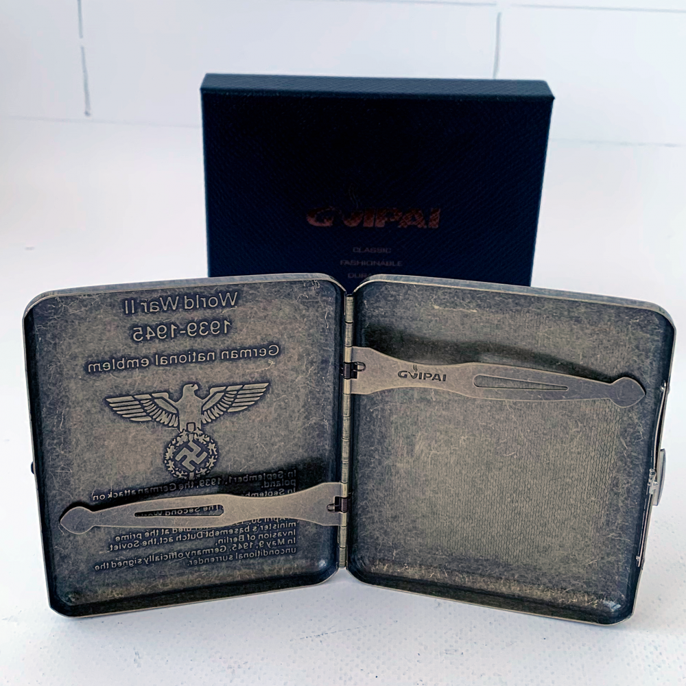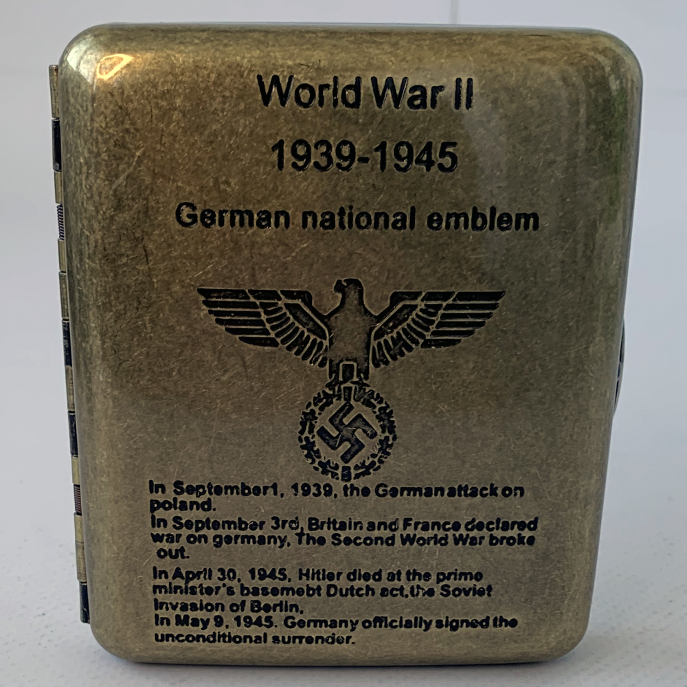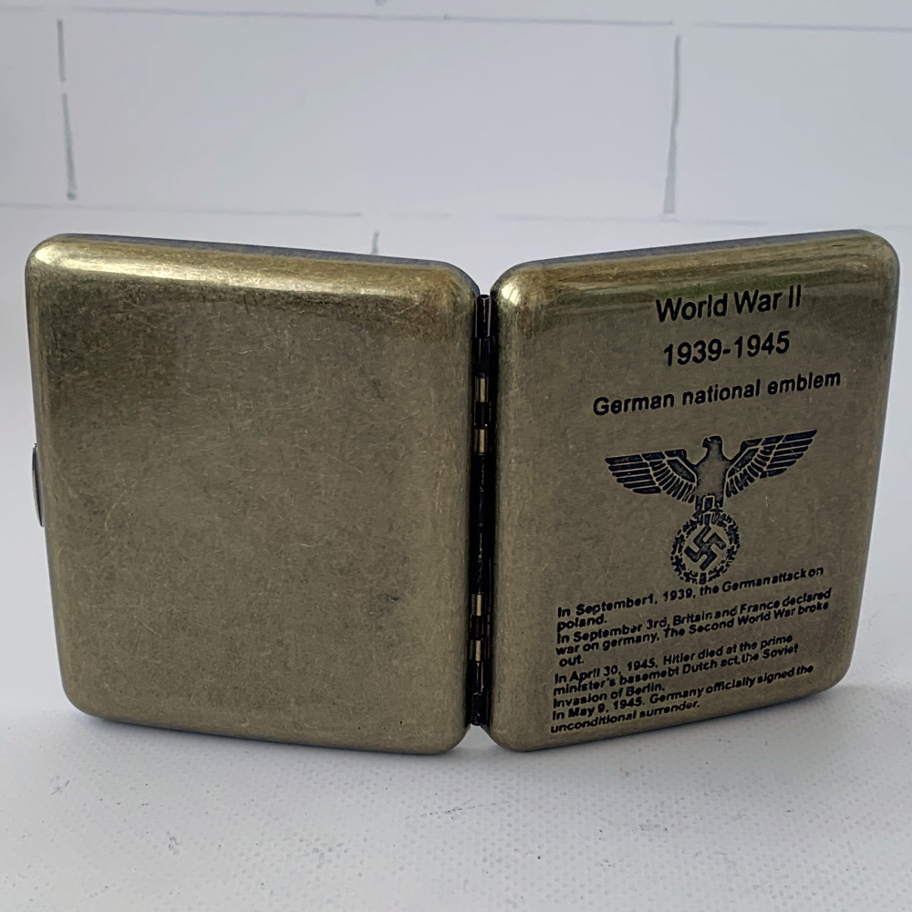 Металлический портсигар в винтажном стиле, выполненный с гравировкой символики периода Второй мировой войны. Можно использовать как аксессуар или тематический сувенир.