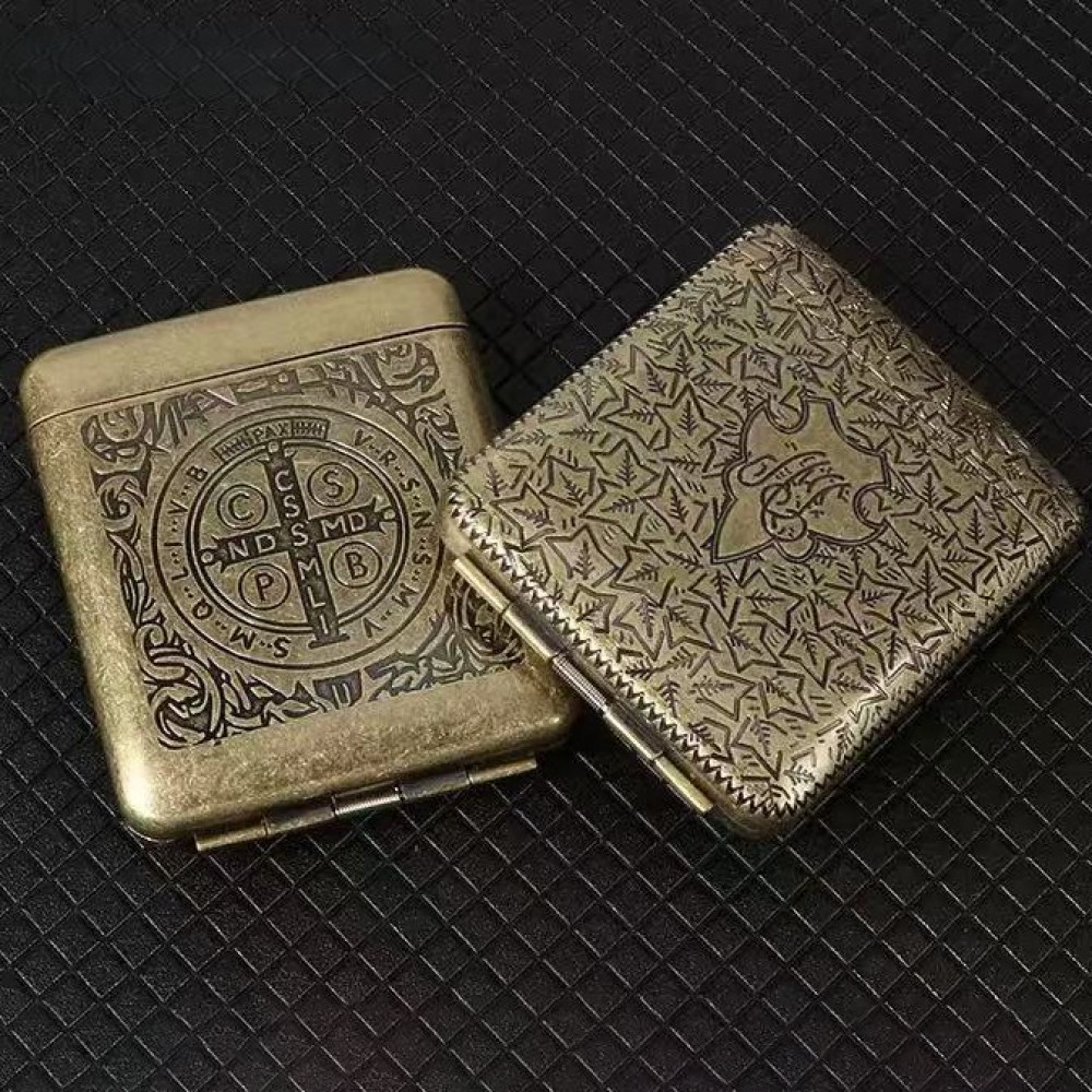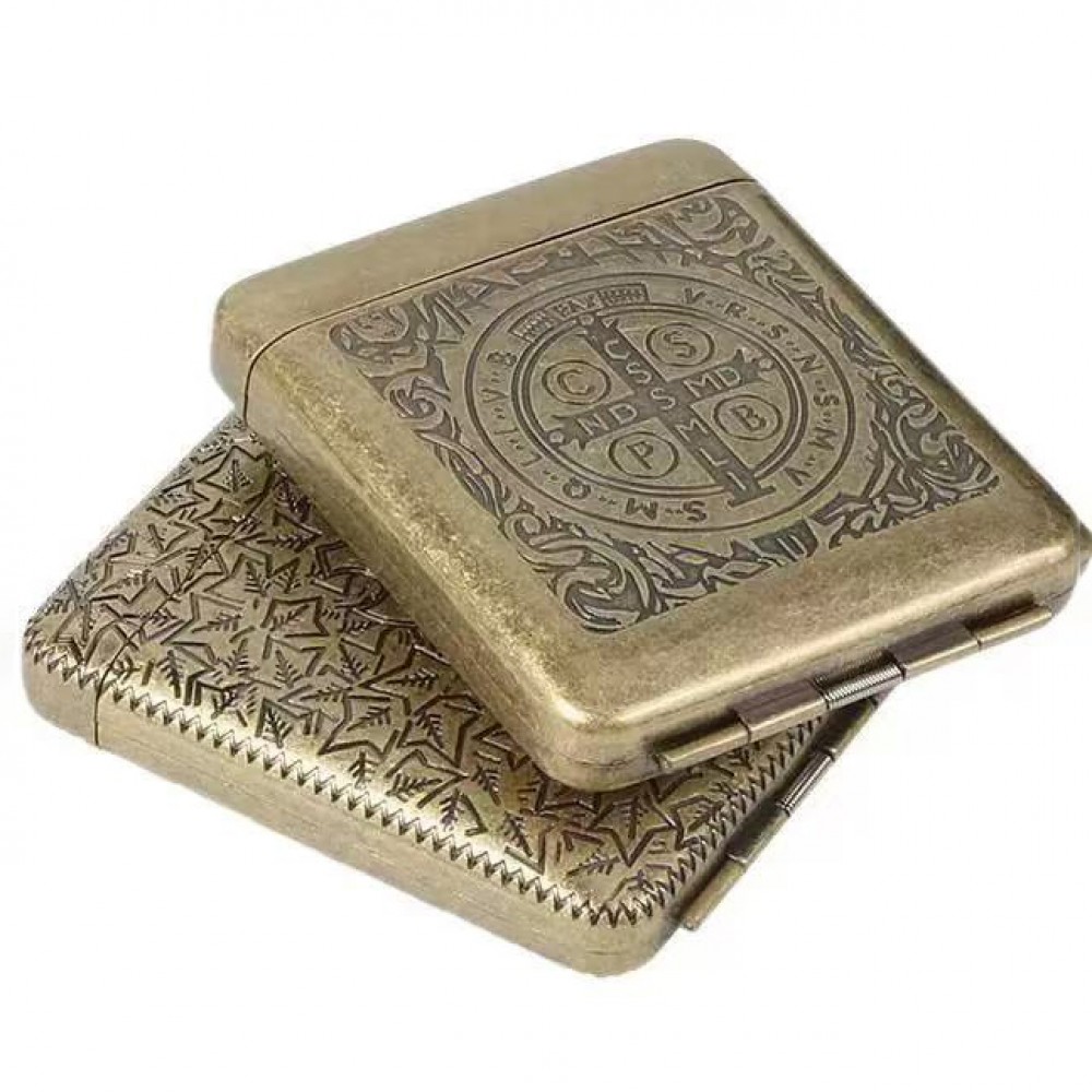 Корпус выполнен в винтажном стиле с декоративным тиснением в виде знаменитого монашеского креста Святого Бенедикта, который считается символом защиты и силы. Такой портсигар станет не только удобным способом хранения сигарет, но и эффектным атрибутом, подчеркивающим индивидуальность владельца.