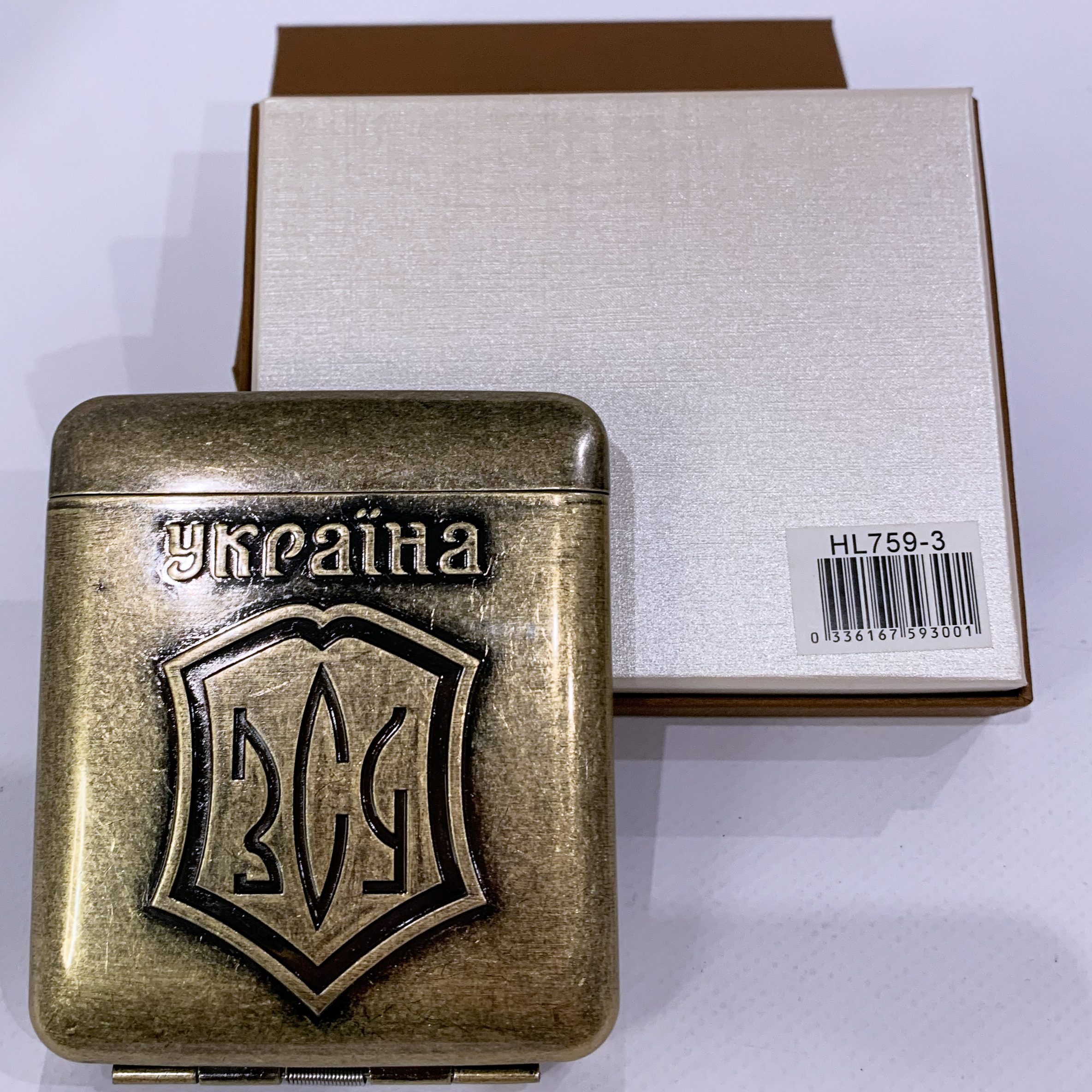 Металлический портсигар с рельефной надписью «Україна» и эмблемой «ВСУ» на щите — практичный аксессуар и одновременно тематический сувенир. Вмещает до 20 стандартных сигарет, защищает их от сминания и загрязнений в кармане или сумке.