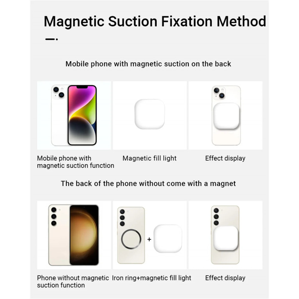 Магнитный дизайн для легкой установки: Встроенный магнитный сердечник делает светильник для селфи сильным и легко устанавливаемым. Совместим с смартфонами Mag-Safe, такими как iPhone 12, 13 и 14 серии; для других моделей смартфонов требуется дополнительный магнитный адаптер. Кроме того, в комплекте идет клип для крепления на других устройствах, таких как ноутбук или iPhone.
