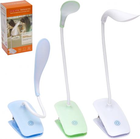 Настільна LED лампа підійде для використання як в офісі, так і вдома. Має гнучку ніжку та прищіпку, 14 світлодіодів LED, три рівні освітленості, сенсорна кпопка вкл/викл. Працює від акумулятора та мережі. У комплекті є кабель USB-Micro USB. Розмір: Висота без урахування плафону 27 см, плафон 15 см