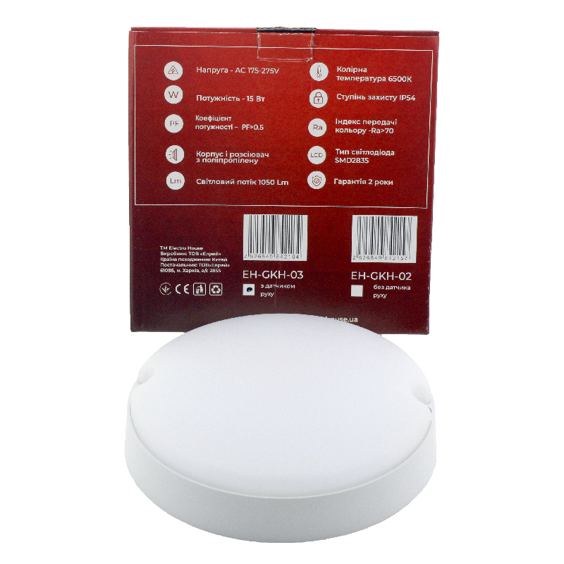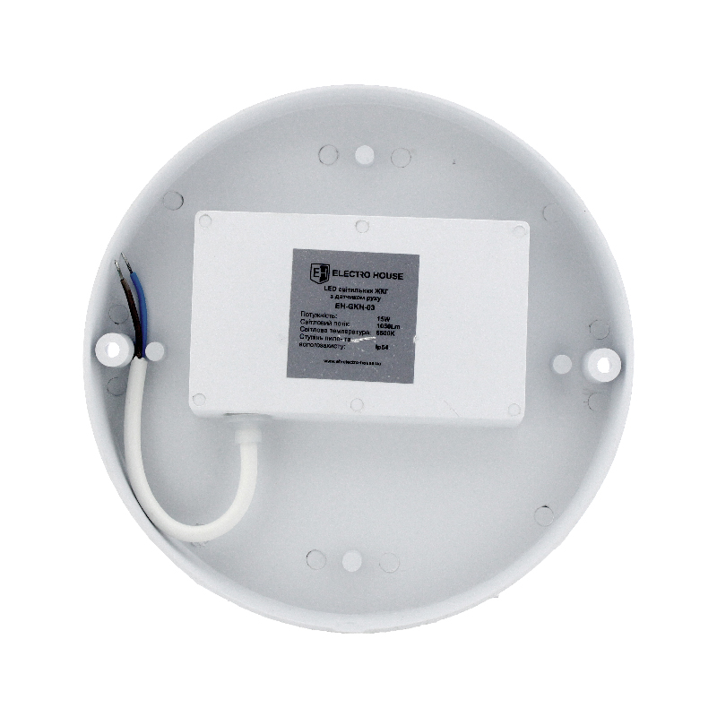 Светильник ЖКХ 15 Вт 1200 Лм 6500К c д.движения EH-GKH-03 торговой марки ElectroHouse является осветительным LED устройством. Имеет мощный световой поток 1200 Лм холодного белого цвета. Отличается простотой и надежностью конструкции. Корпус выполнен из высококачественных и экологически чистых материалов и отвечает международному классу безопасности IP54, что делает его устойчивым к повышенной влажности, пылеобразованию, перепадам температуры, а также к вибрациям. Рассеиватель обеспечивает равномерность свечения, что дает хорошую освещенность. Имеется встроенная система защиты от перенапряжения.