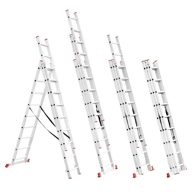 Универсальная алюминиевая 3-х секционная раскладная лестница LT-0308 ТМ INTERTOOL незаменима как в строительстве так и в быту. Лестница LT-0308 изготовлена из высококачественного экструдированного алюминиевого профиля, соответствует европейскому стандарту EN131. При весе 10,8 кг выдерживает нагрузку до 150 кг. Каждая из 3-х секций оснащена 8 рифлеными ступенями шириной 280 мм. Высота в разложенном виде 5087 мм, в сложенном 2286 мм. Противоскользящие опорные заглушки обеспечивают надежное сцепление с опорной поверхностью, препятствуют скольжению. Может применяться как приставная, выдвижная лестница и свободностоящая стремянка. Атмосферостойкие ленты предотвращают самопроизвольное раздвижение боковин.