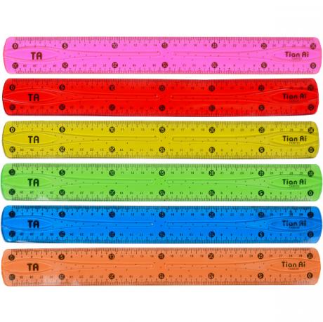 Лінійка виготовлена з гнучкого, нетоксичного пластику. Розмітка шкали виконана тисненням чорною фарбою, стійкою до стирання, що забезпечує довгу службу вироби. Легко гнуться. Довжина: 30 см