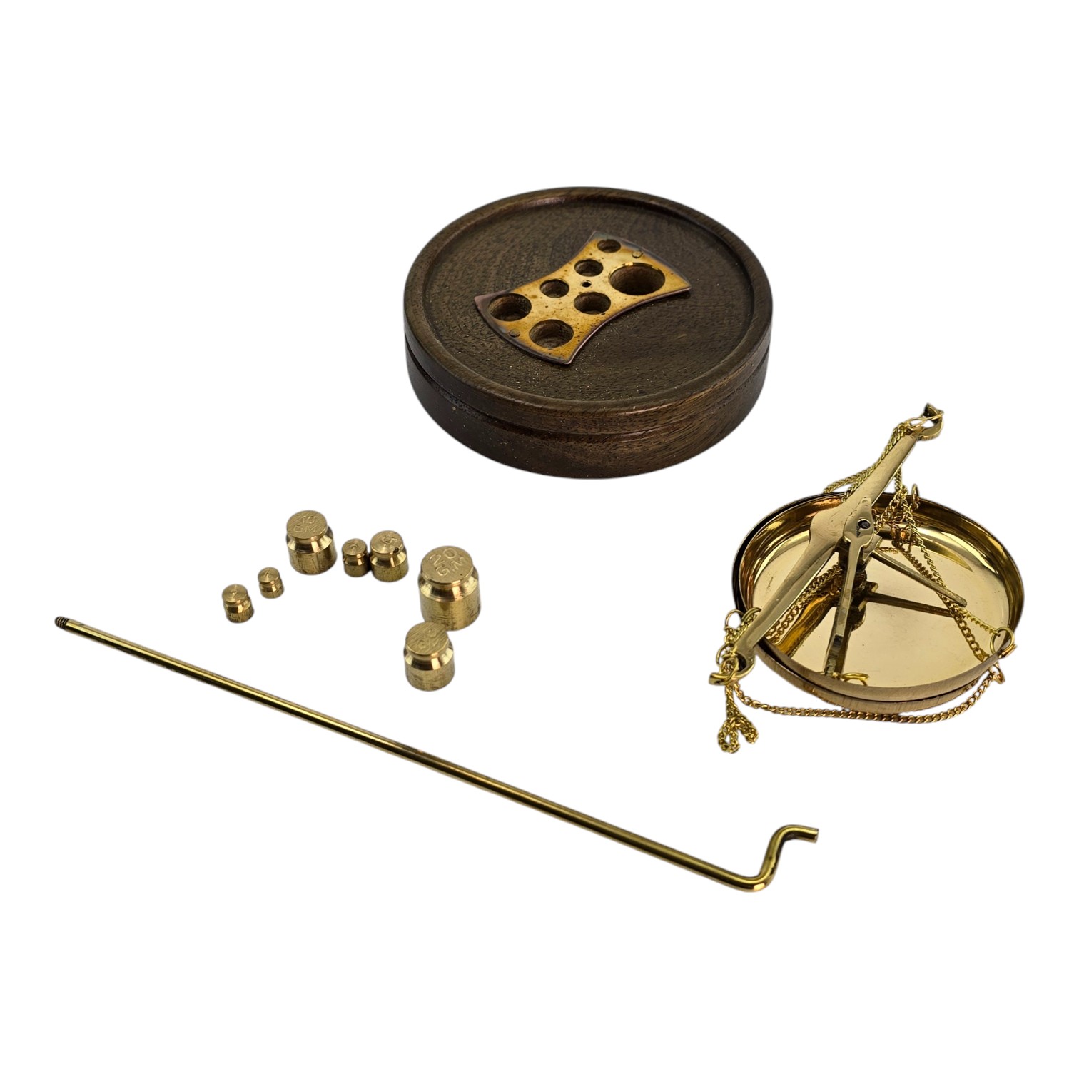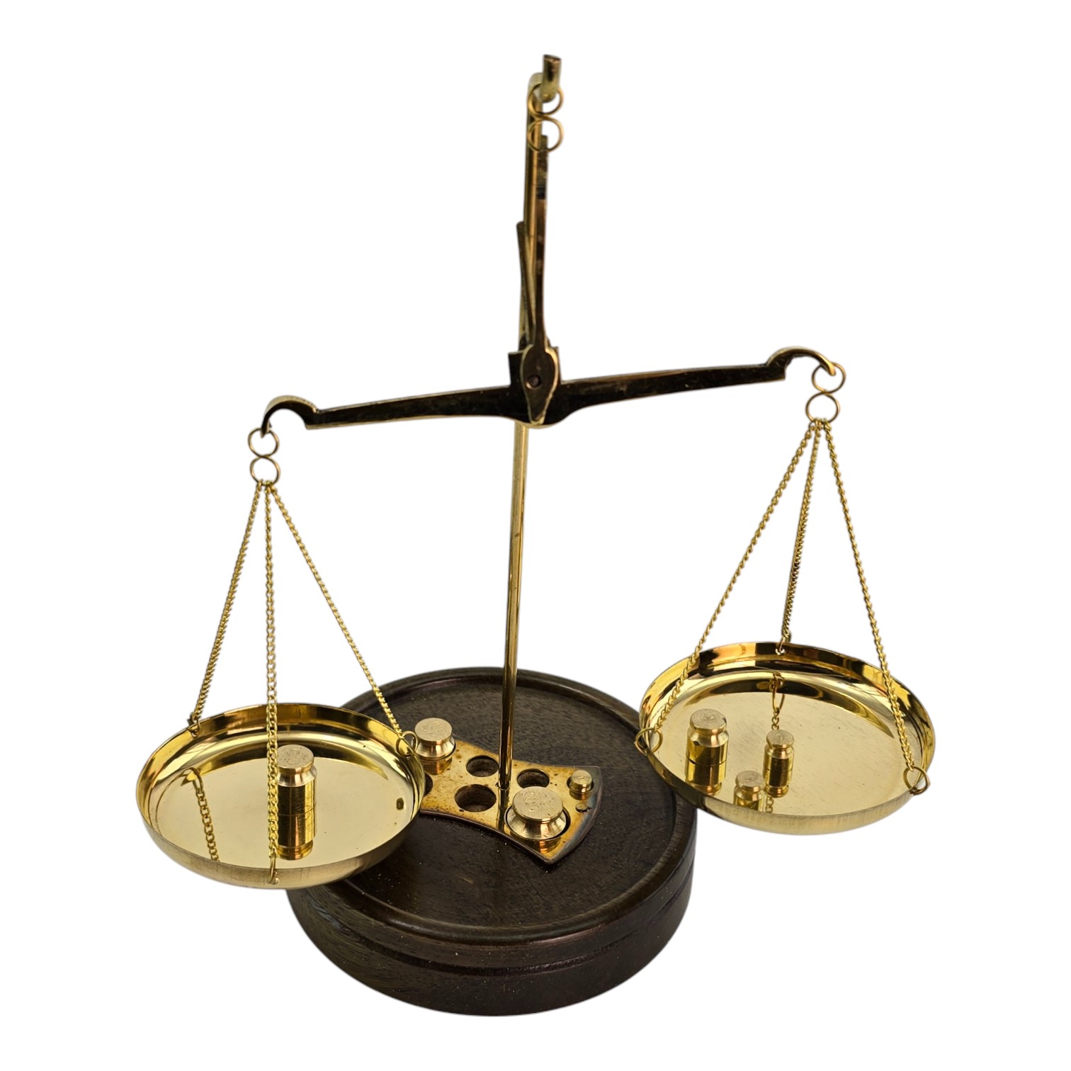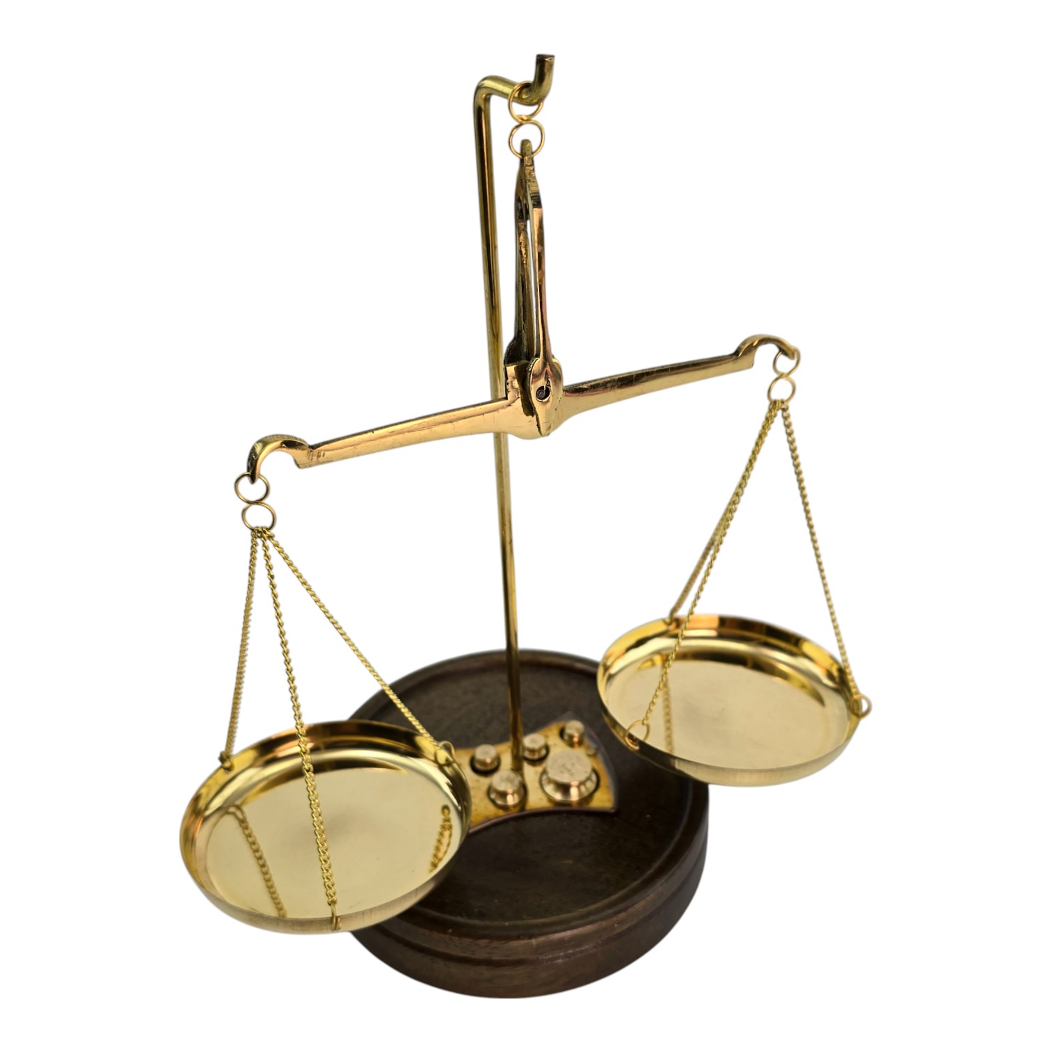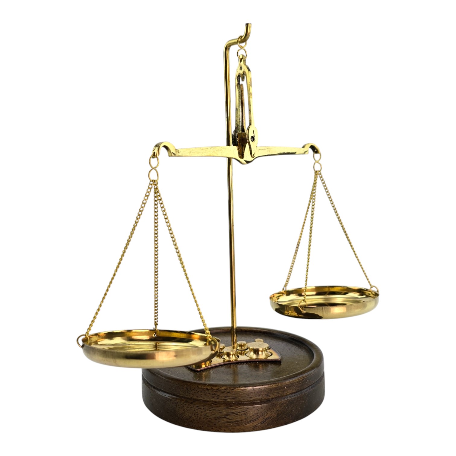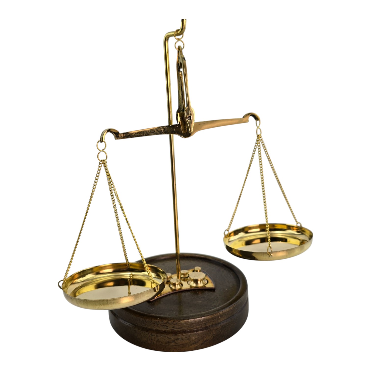 Классические настольные весы из латуни на деревянной основе сочетают функциональность и выразительный внешний вид. Металлические элементы имеют золотистый оттенок, основание выполнено из натурального дерева. В комплект входит набор из 7 гирь различного веса для точного взвешивания небольших предметов. Компактные размеры позволяют использовать весы в кабинете, мастерской или в качестве тематического декора. Две чаши диаметром 6,5 см обеспечивают удобный и наглядный процесс измерения. Изготовлены в Индии с сохранением традиционной формы и конструкции.