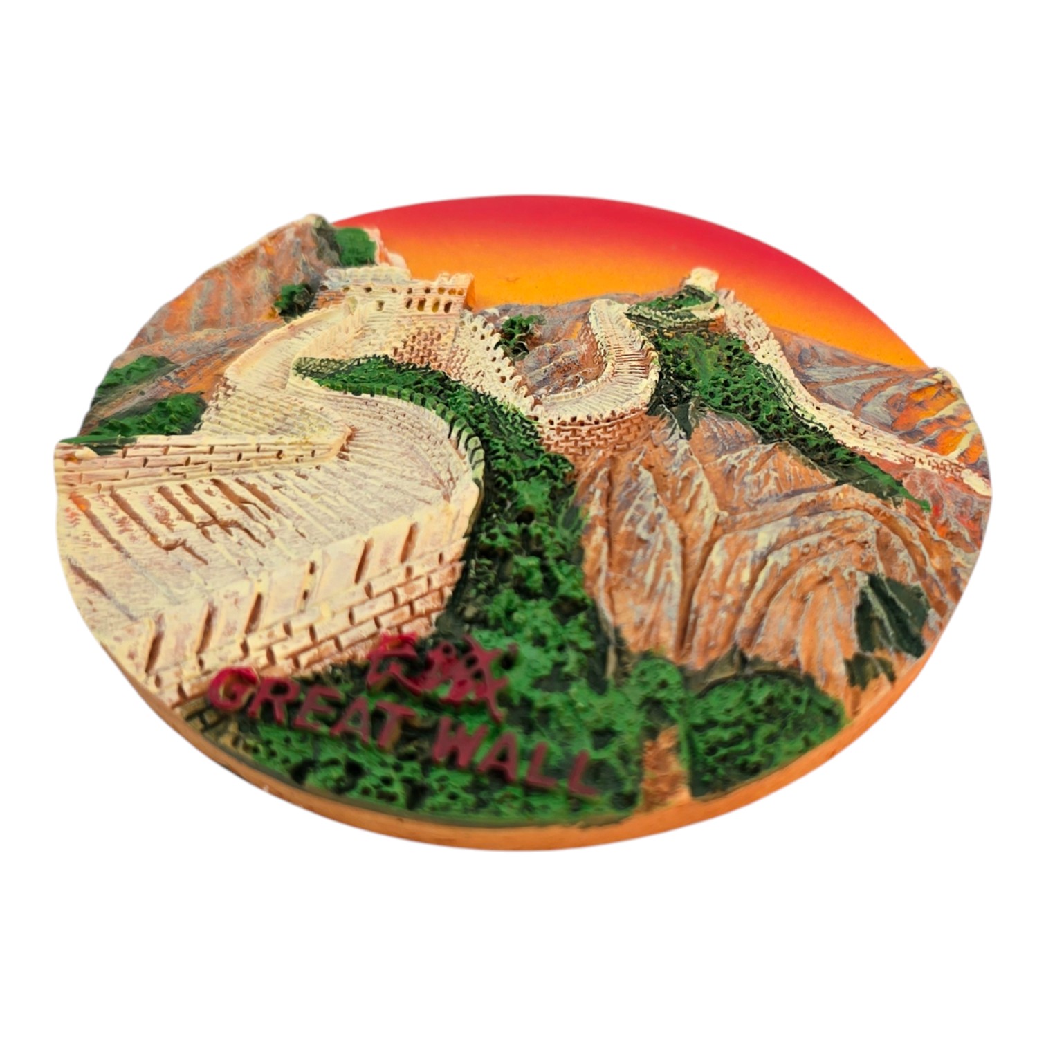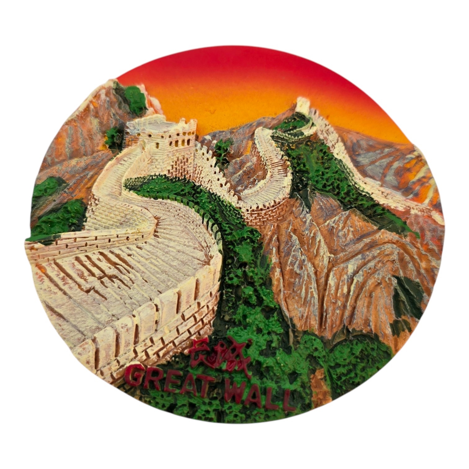 Сувенирный круглый магнит с объёмным изображением Великой китайской стены. Полимерная основа, с обратной стороны магнит для крепления на металлические поверхности. Подходит для холодильника, магнитной доски или офисного шкафчика. Компактный подарок и пополнение коллекции магнитов. Производство Китай.