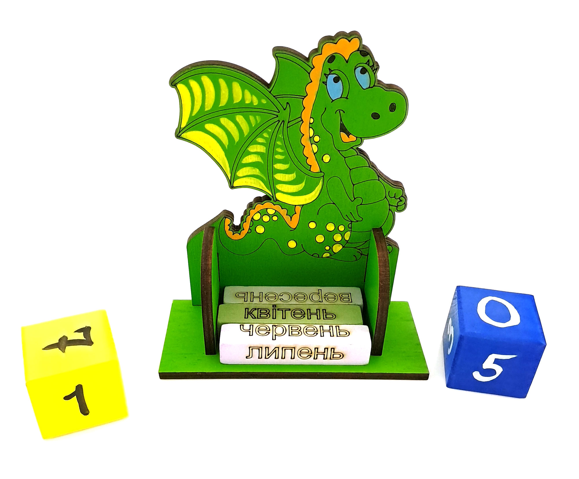 Календарь имеет компактный размер 165х145х60 мм, что позволяет легко разместить его на вашем столе, полке или комоде. Кубики с числами, выполненные в желтом и синем цвете, добавляют календарю ярких акцентов и делают переключение дат быстрым и удобным.